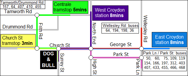 click for a map with East Croydon station click for a map with Centrale tramstop click for a map with Church Street tramstop click for a map with West Croydon station click to go to Dog & Bull website